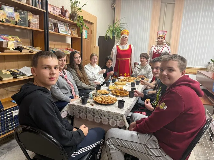 В заключение гости праздника собрались в холле библиотеки на вкусной локации «Русская кухня», где угостились душистым караваем, вкусными блинами и пирогами с ароматным чаем.