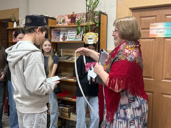На площадке читального зала «Мой край – земля согласия» библиотекарь провела познавательную викторину, во время которой гости показали свои знания о сказках разных народов России.