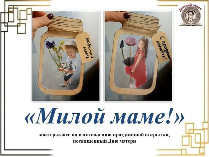Библиотекарь рассказала детям об истории Дня матери и познакомила с тематическими книгами. Кульминацией мероприятия стало создание праздничной открытки: ребята смастерили оригинальную открытку в виде баночки, украшенной фотографией ребенка с букетом и сухоцветами.