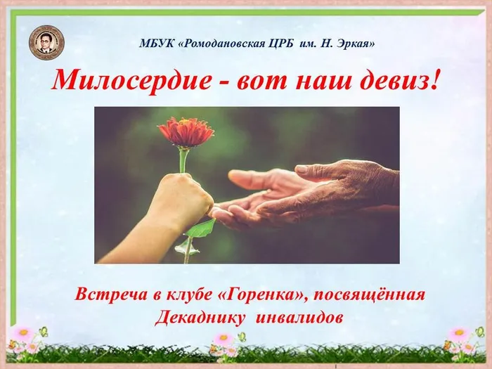 О таких качествах человеческой души как милосердие, доброта, искренность, сострадание, сопереживание говорили сотрудники сектора искусства и краеведения МБУК «Ромодановская ЦРБ им. Н. Эркая» на встрече «Милосердие – вот наш девиз!», состоявшейся 4 декабря с членами клуба «Горенка», посвящённой проходящей Декаде инвалидов.