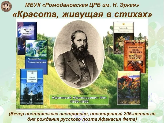 Сегодня сотрудники отдела обслуживания в рамках программы «Пушкинская карта» со студентами Ромодановского филиала ГБПОУ РМ «Кемлянский аграрный колледж» провели вечер поэтического настроения «Красота, живущая в стихах». На мероприятии присутствующие познакомились с жизнью и творчеством удивительного поэта, лирика Афанасия Афанасьевича Фета. Рассказ сопровождался презентацией. Каждый присутствующий смог погрузиться в мир его поэзии и прочувствовать всю глубину его произведений.