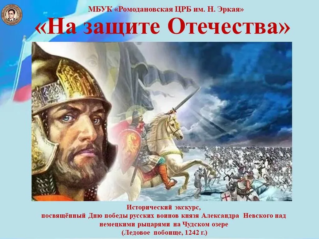 В преддверии этой памятной даты, с целью формирования чувства патриотизма, уважения к историческому прошлому, для учащихся старших классов МБОУ «Ромодановская СОШ №1», сотрудники отдела обслуживания в рамках программы «Пушкинская карта» провели исторический экскурс «На защите Отечества», посвящённый Дню победы русских воинов князя Александра Невского над немецкими рыцарями на Чудском озере.