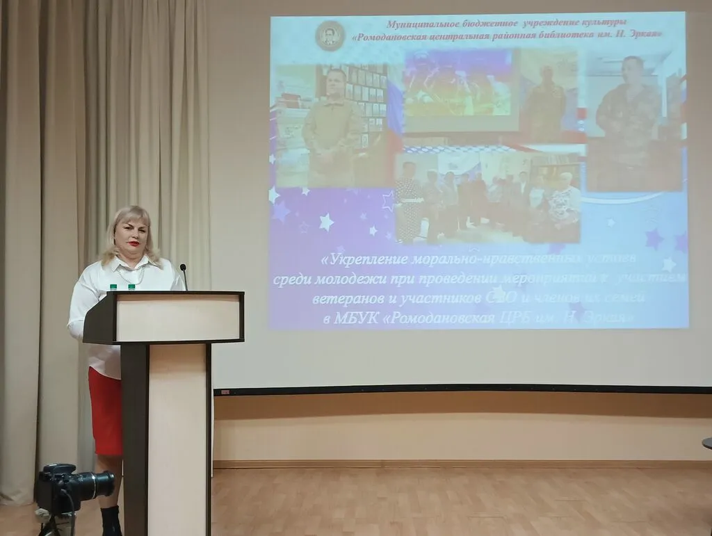 По традиции, работа форума состояла из пленарного заседания и работы 2 секций. На секции «Библиотека как экосистема единства: от народных традиций к социальному здоровью нации» с докладом «Укрепление морально-нравственных устоев среди молодежи при проведении мероприятий с участием ветеранов и участников СВО и членов их семей» выступила заведующий отделом обслуживания Никитина Людмила Викторовна.